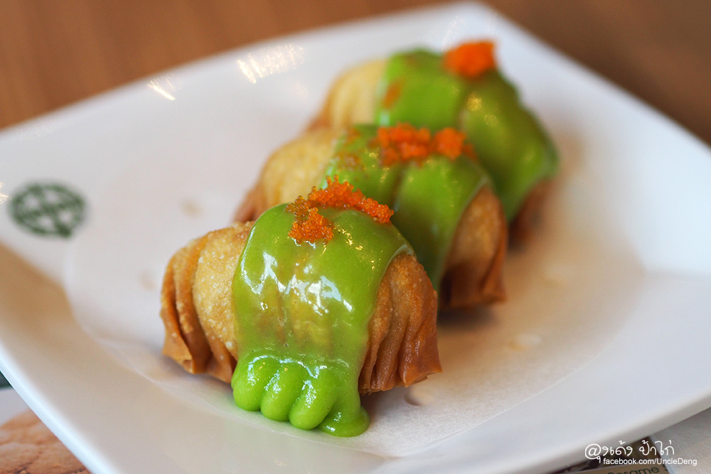 เกี๊ยวกุ้งราดซอสวาซาบิ (Wasabi Salad Prawn Dumpling) ราคา 130.- น่าจะเป็นเมนูฟิวชั่นจานเดียวของร้านที่เป็นเกี๊ยวกุ้งสับทอดสีเหลืองกรอบราดด้วย ซอสวาซาบิ (มาโยเนส ผสม วาซาบิ) แล้วประดับด้วยไข่กุ้งสีส้ม (จริงๆ คือไข่ปลา แต่คนไทยเรียกไข่กุ้ง)