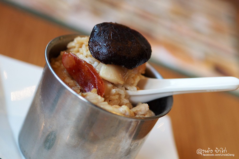 ข้าวหน้าไก่ กุนเชียงและเห็ด (Rice with Chicken Sausage & Mushroom) ราคา 120.- ข้าวนึ่งในถ้วยสแตนเลส อัดแน่นด้วยเนื้อไก่ปรุงรสหมักได้รสชาติ เห็ดหอม และกุนเชียงนำเข้าจากสิงคโปร์ ราดด้วยซอสสูตรพิเศษ จะกินในถ้วย หรือ ตักใส่จานแบ่งกันได้ตามสะดวก