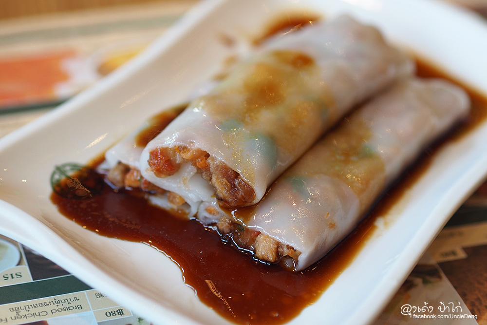 ก๋วยเตี๋ยวหลอดหมูแดง (Vermicelli Roll with BBQ Prok) ราคา 120.- เมนูนี้บอกถึงความสามารถของร้านในการทำแป้งได้เป็นอย่างดี แป้งทำสดทุกจาน บางใส มองทะลุเห็นไส้หมูแดงด้านใน ราดด้วยซอสสูตรพิเศษของทิมโฮวาน เป็นอีก 1 เมนูที่ไม่ควรพลาด เมนูก๋วยเตี๋ยวหลอดมีให้เลือก 4 แบบคือ ไส้ตับหมู ไส้กุ้ง ไส้หมูแดง และ ก๋วยเตี๋ยวหลอดซอสงา