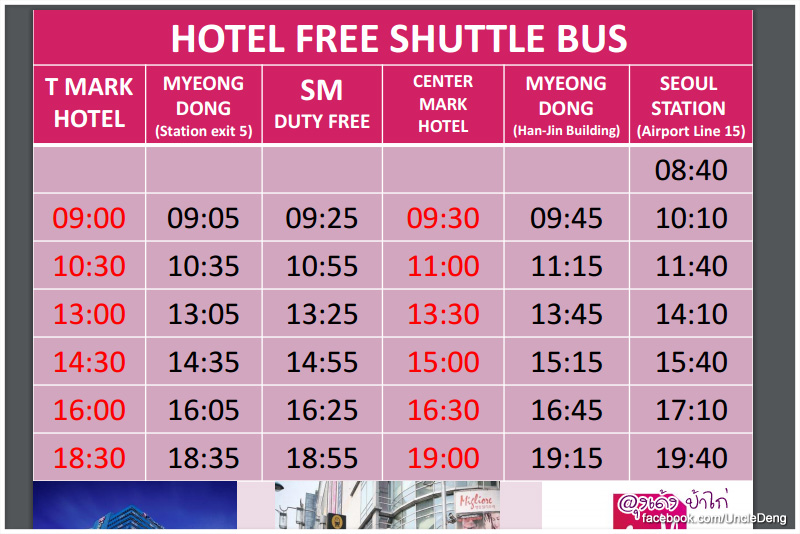 รวมถึง บริการฟรี Shuttle Bus รับส่งจากโรงแรม ไปยัง Myeong Dong / SM Duty Free / Center Mark Hotel ย่านอินซาดง / และ Seoul Station