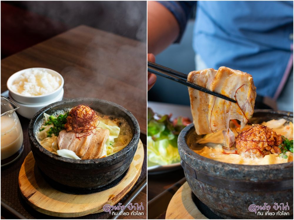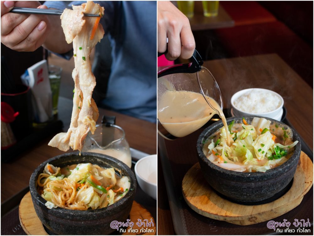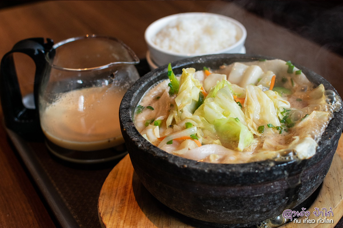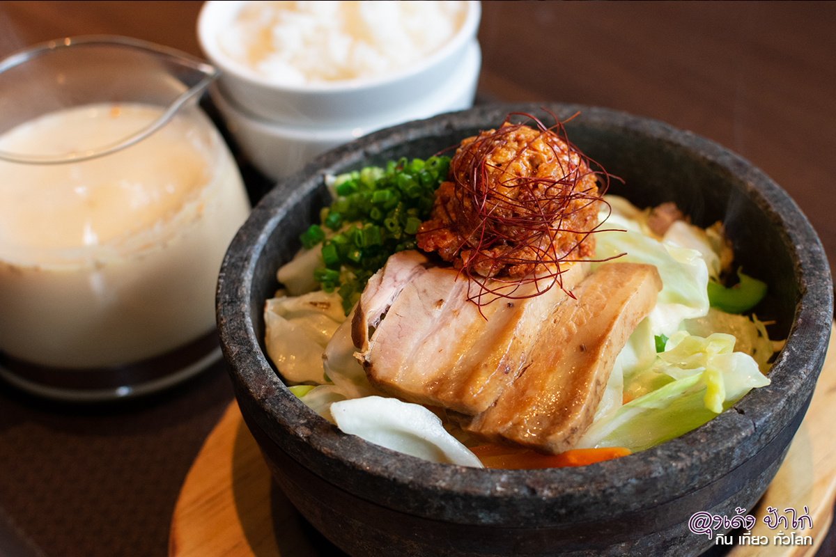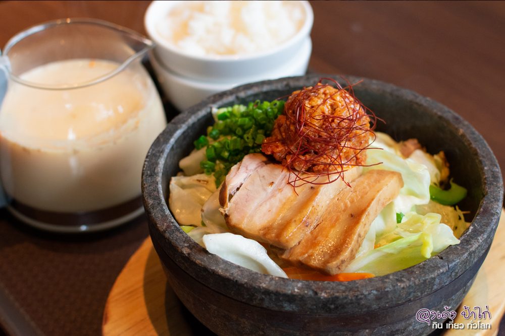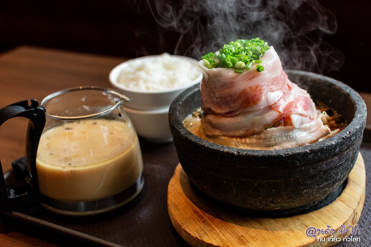 ดูกันชัดๆ! เนื้อหมูชิ้นใหญ่มาก ในเมนูที่เป็นชามภูเขาไฟ เส้นราเมนจะใหญ่ เหนียวนุ่ม เพราะหม้อหินอบความร้อน 300 องศาเซียลเซียส ทำให้ชามร้อนตลอดเวลา กินไปนานๆ ยังร้อนอยู่เลย น้ำซุปเบสเป็นทงคตสึ หรือซุปกระดูกหมู ให้ผักเยอะมาก ทำให้น้ำซุปหวานกล่อมกลมขึ้นมาก