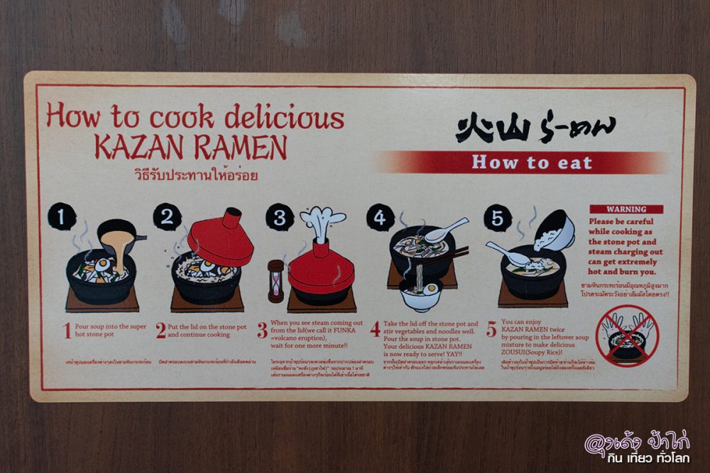 ที่นี่มีกิมมิกคือ จะทำให้ชามราเมนของคุณกลายเป็นภูเขาไฟที่กำลังระอุ โดยพนักงานจะเติมน้ำเข้าไปในชามหินร้อนๆ ที่ถูกอบมาในอุณหภูมิ 300 องศา แล้วเอาฝามาครอบ ทำจะมีควันพุ่งออกมา เหมือนภูเขาไฟกำลังจะปะทุ