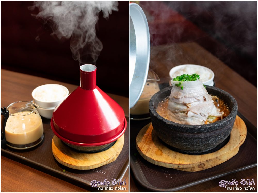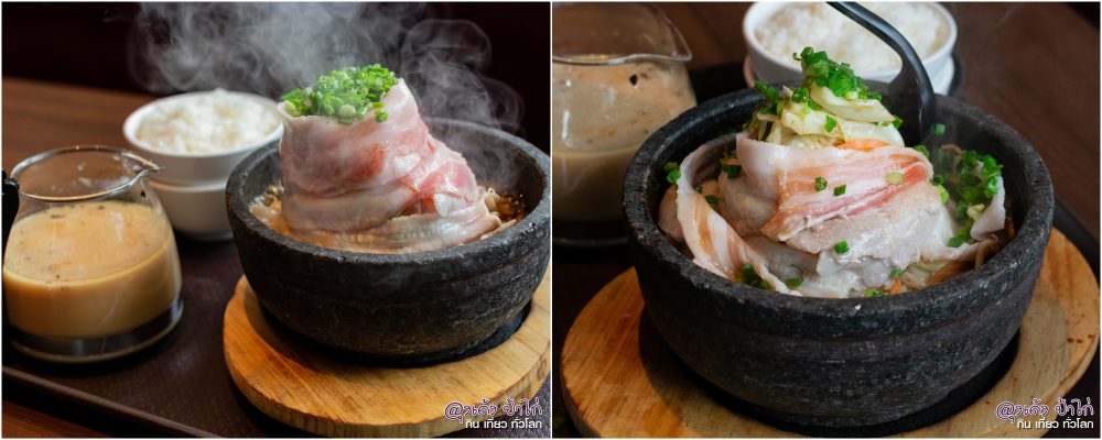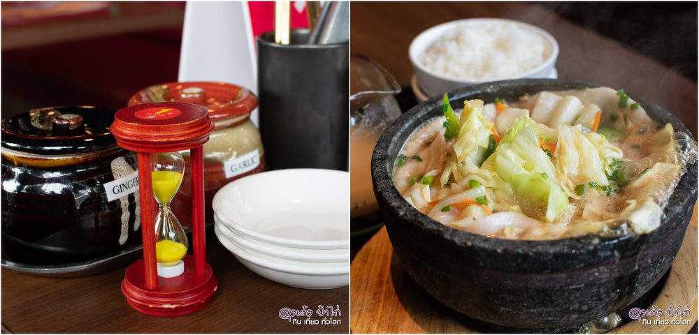 โดยใช้นาฬิกาทรายในการจับเวลา พอหมดเม็ดทราย เปิดฝา หมูก็จะสุกพอดี กลิ่มหอมลอยเตะจมูกมาก แล้วเริ่มทานได้เลย
