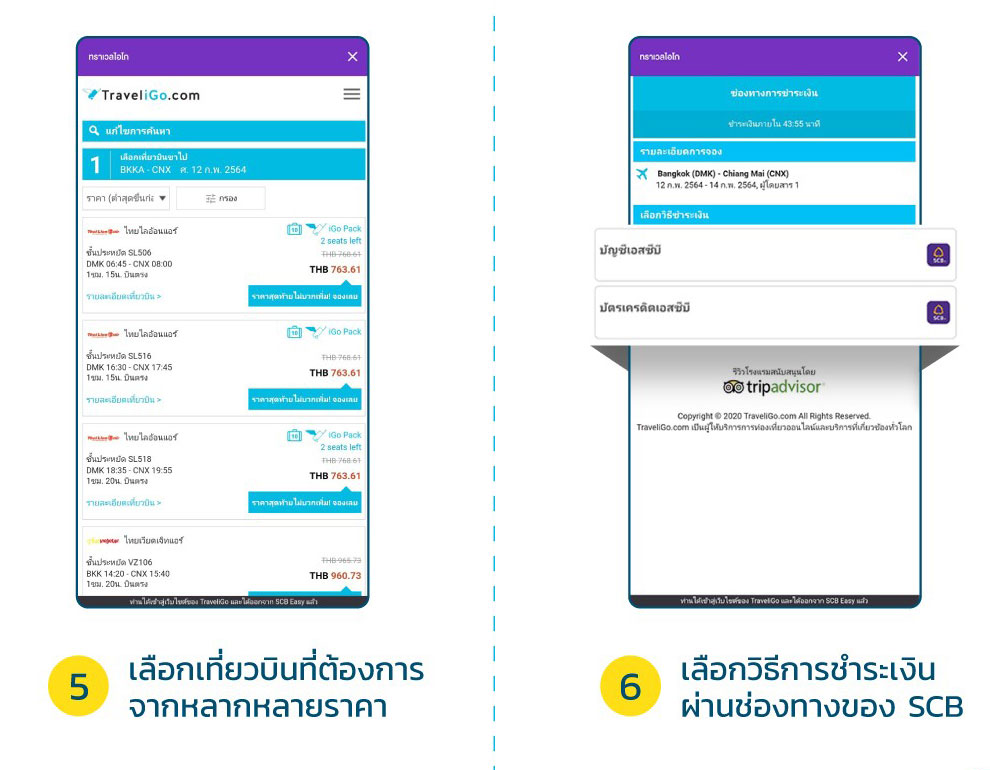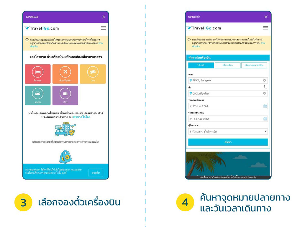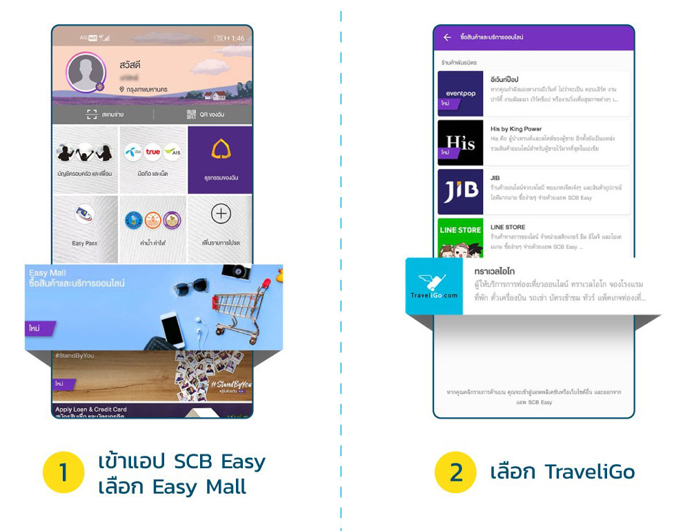 แนะนำเพื่อนๆ โหลด SCB Easy App -> เลือก Easy Mall -> เลือก TraveliGo ->เลือกสินค้า และบริการที่ต้องการ -> เลือกจุดหมายปลายทาง และวันเวลาเดินทาง -> เลือกสินค้าบริการที่ต้องการ และราคาที่ต้องการ -> เลือกวิธีการชำระเงิน ผ่านช่องทางของ SCB