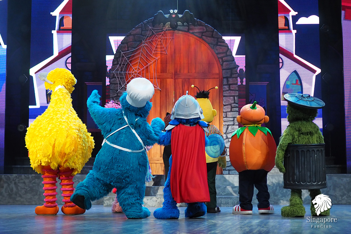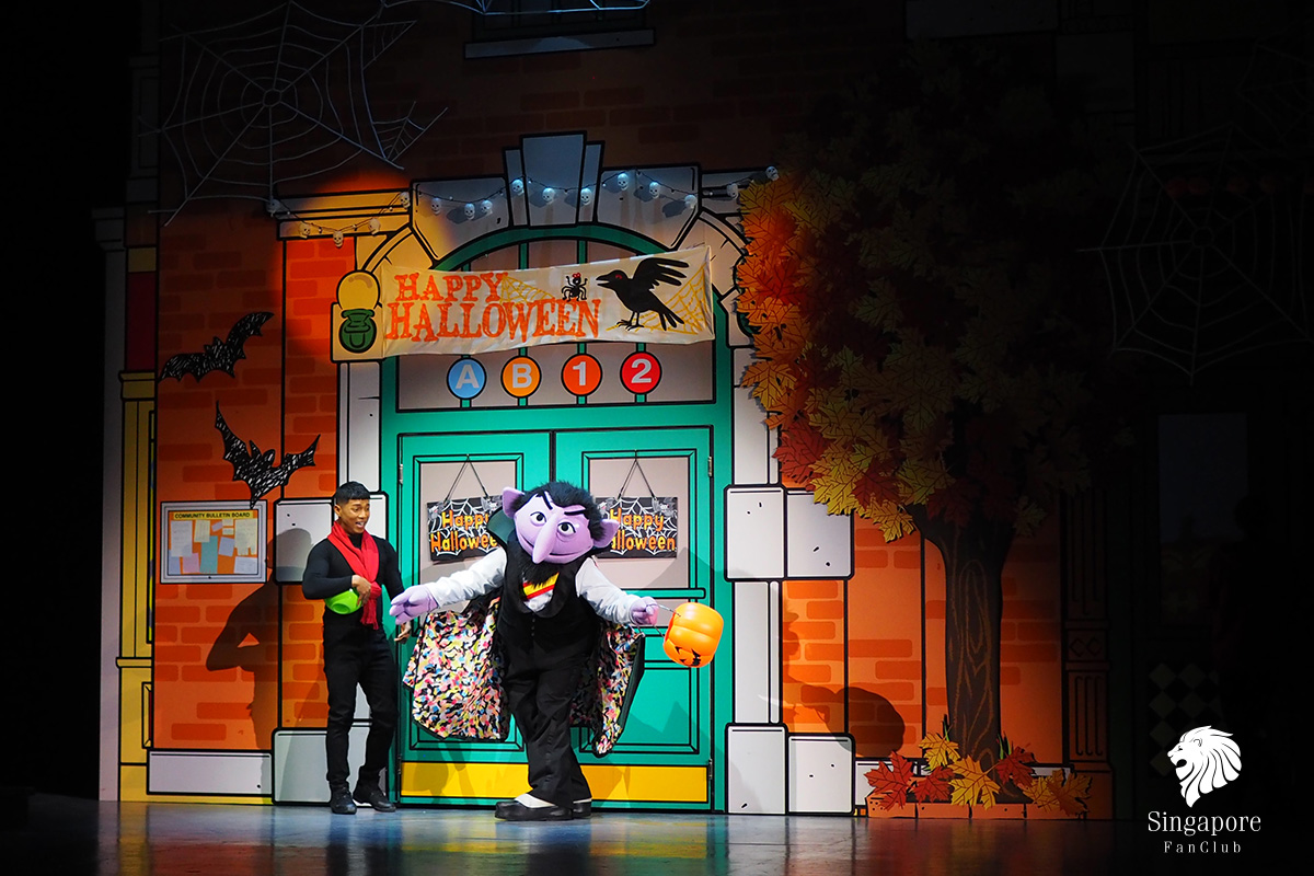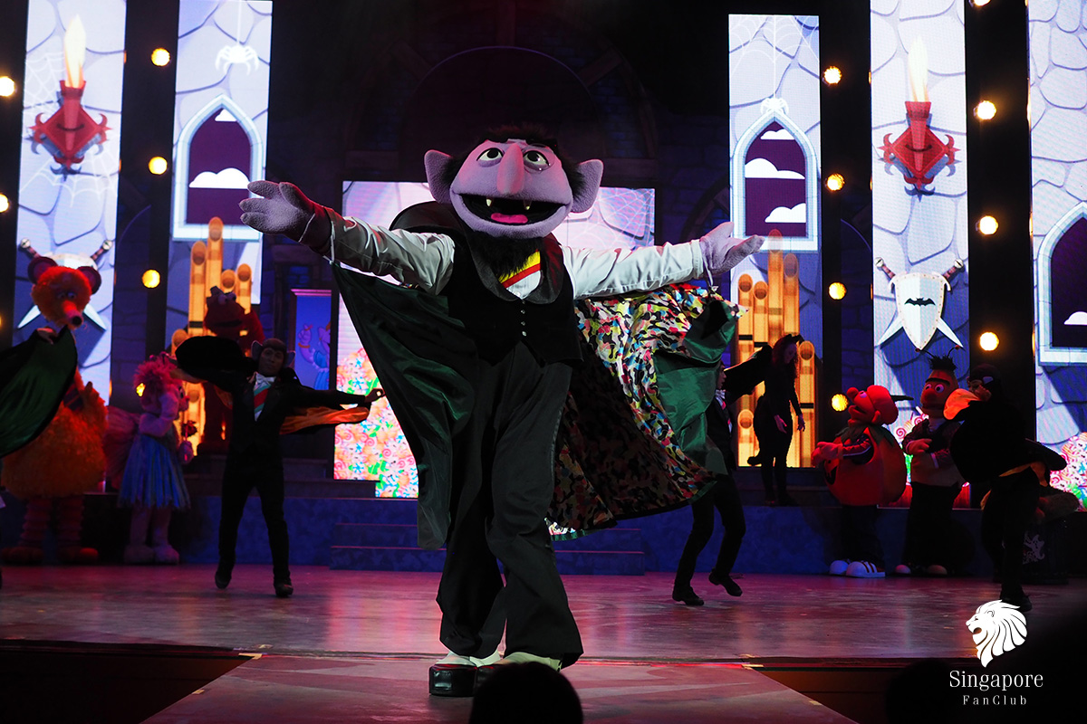 ตัวละครหลักๆ มากันเกือบครบบนเวที เช่น Elmo, Big Bird, Cookie Monster, Bert, Oscar the Grouch, และตัวละคนที่เด่นที่สุดบนเวทีนี้คือ Count von Count เพราะนี่คือเทศกาล Halloween