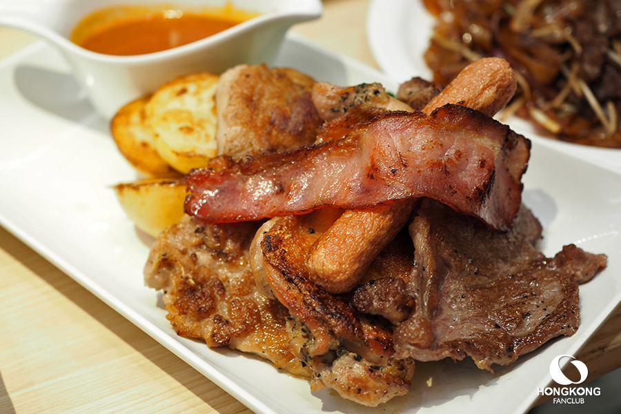 สเต็กรวมจานร้อน Mixed Grill (Beef Steak, Chicken, Pork Chop, Bacon & Sausage) w/ Red Wine Grav ราคา HK$ 105 เหรียญ