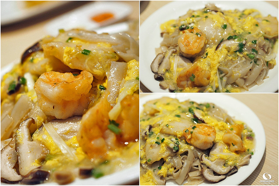 จานนี้มีทั้งกุ้ง และเนื้อปลา น้ำราดหน้าจะใส่ไข่ แล้วคนให้ข้น ราดบนเส้นก๋วยเตี๋ยว เช่นกันอาหารฮ่องกงจานใหญ่มาก จานเดียวอิ่ม