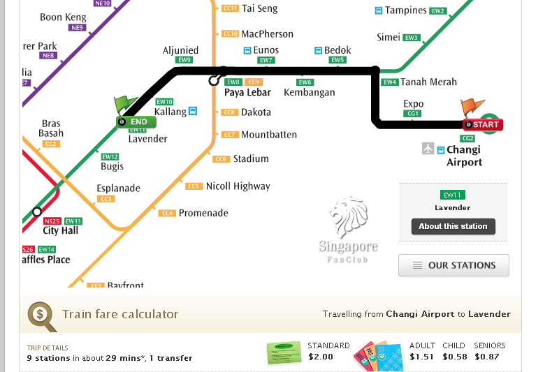 เริ่มต้นจากสนามบิน Changi Airport (CG2) ไปลงที่ Tanah Merah (EW4)