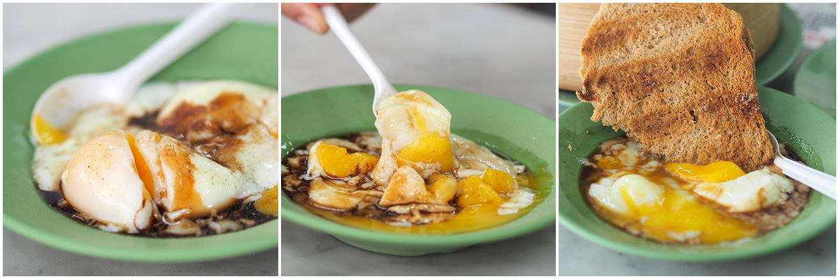 บนโต๊ะจะมี ซีอิ้วขาว และซีอิ้วดำ เกลือ พริกไทย : เพื่อน ลุงเด้งป้าไก่ ที่เป็นคนสิงคโปร์ บอกว่า ใส่ซีอิ้วดำเล็กน้อย แล้วตามด้วยพริกไทย ( คน มาเลเซีย กับ คนสิงคโปร์ ชอบกินซีอิ้วดำ - รสชาติไม่เหมือน ซีอิ้วดำเมืองไทยนะ ) แต่บางคนก็ใส่ ซีอิ้วดำ + ซีอิ้วขาว อันนี้แล้วแต่ชอบ ... จากนั้นก็ "เจาะไข่แดง" แล้วหยิบ Kaya Toast จิ้มไปในไข่ ให้ชุ่ม แล้ว ส่งเข้าปากเลยครับ