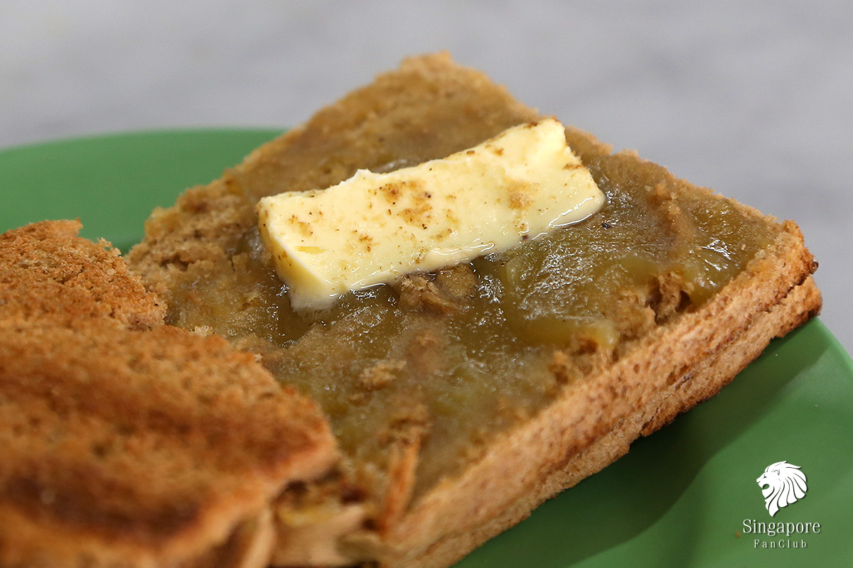 สังขยาสิงคโปร์ หรือ "คายา - Kaya" ทำจาก กะทิ ไข่ ใบเตย และ น้ำตาลไหม้ สีที่ได้จึงมีสีน้ำตาล ( บางสูตรใช้ น้ำตาลโตนด | น้ำตาลมะพร้าว ) คนสิงคโปร์ เรียกว่า " Kaya Jam - คายา แยม " - ขนมปังปิ้ง ใช้ ขนมปังธัญพืชสีน้ำตาล ขนาดก็เท่ากับ ขนมปังบ้านเรานี่แหละ ย่างจนกรอบ แล้วใช้ มีด สไลด์ ออกเป็น 2 แผ่น บางๆ ( ต้องใช้ความชำนาญ เลยนะ ) แล้ว ทาด้วย คายา แล้ว วางเนยสด 1 ชิ้น เป็นอันจบขั้นตอน