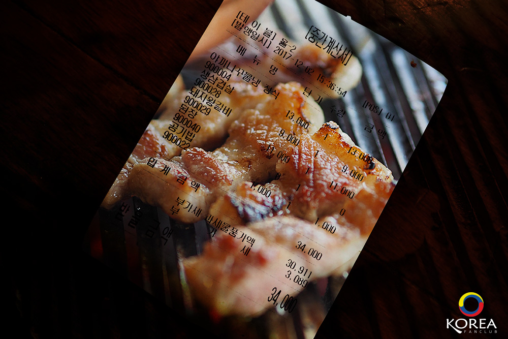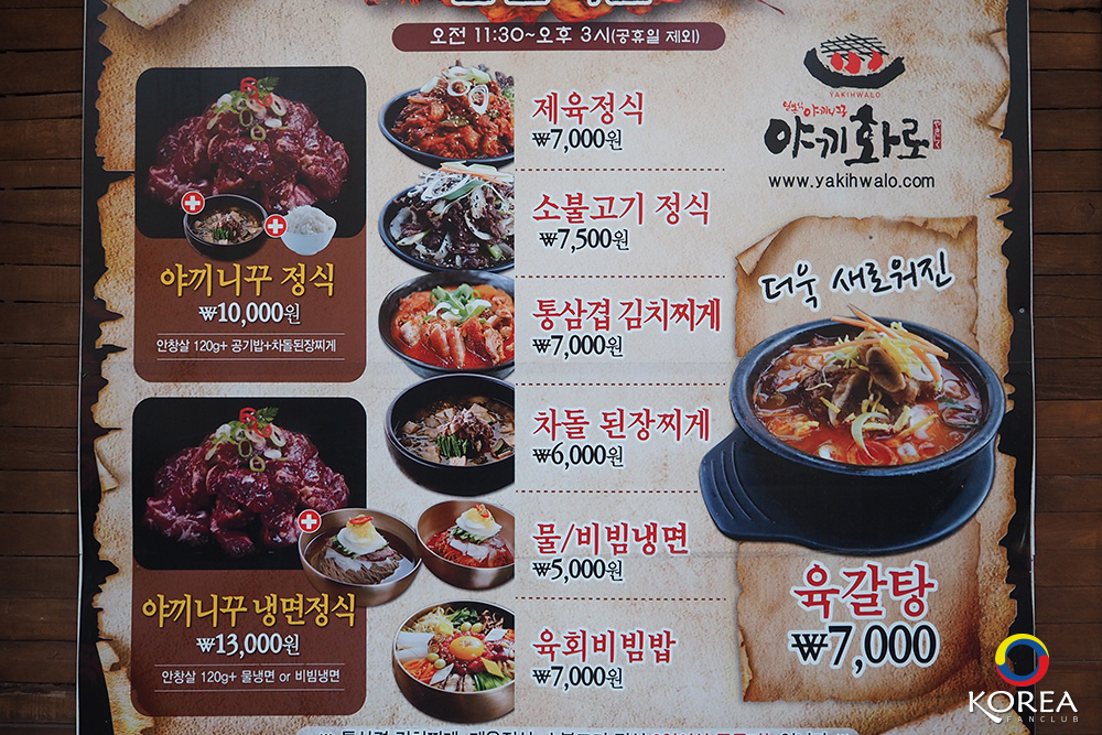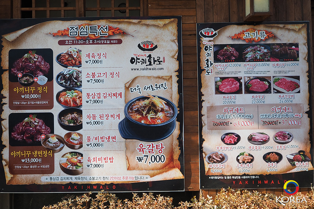 ในร้านมีเมนูพร้อมรูปภาพระบุราคาชัดเจน พนักงานพอสื่อสารภาษาอังกฤษได้บ้าง โดยพื้นฐานราคาอาหารจัดว่าไม่แพงเลยครับ (ค่อนข้างถูกด้วยซ้ำเมื่อเทียบกับของที่ได้มา) จากในภาพ ล่างซ้ายมือ ลุงเด้งป้าไก่ สั่งชุด ราคา 13,000 วอน ชุดเนื้อย่าง + 물냉면 (มุลแนงมยอน) หรือบะหมี่เย็นแบบน้ำ บอกเลยว่าถูกมาก