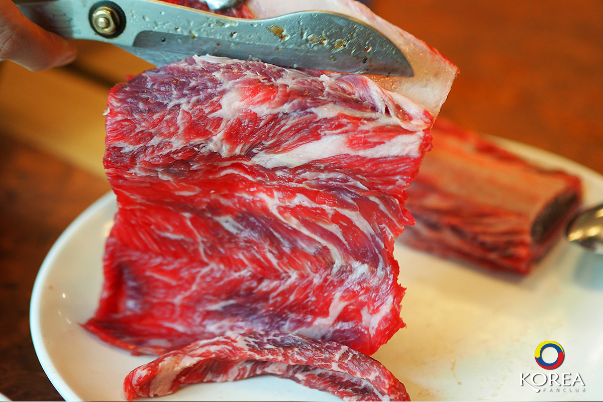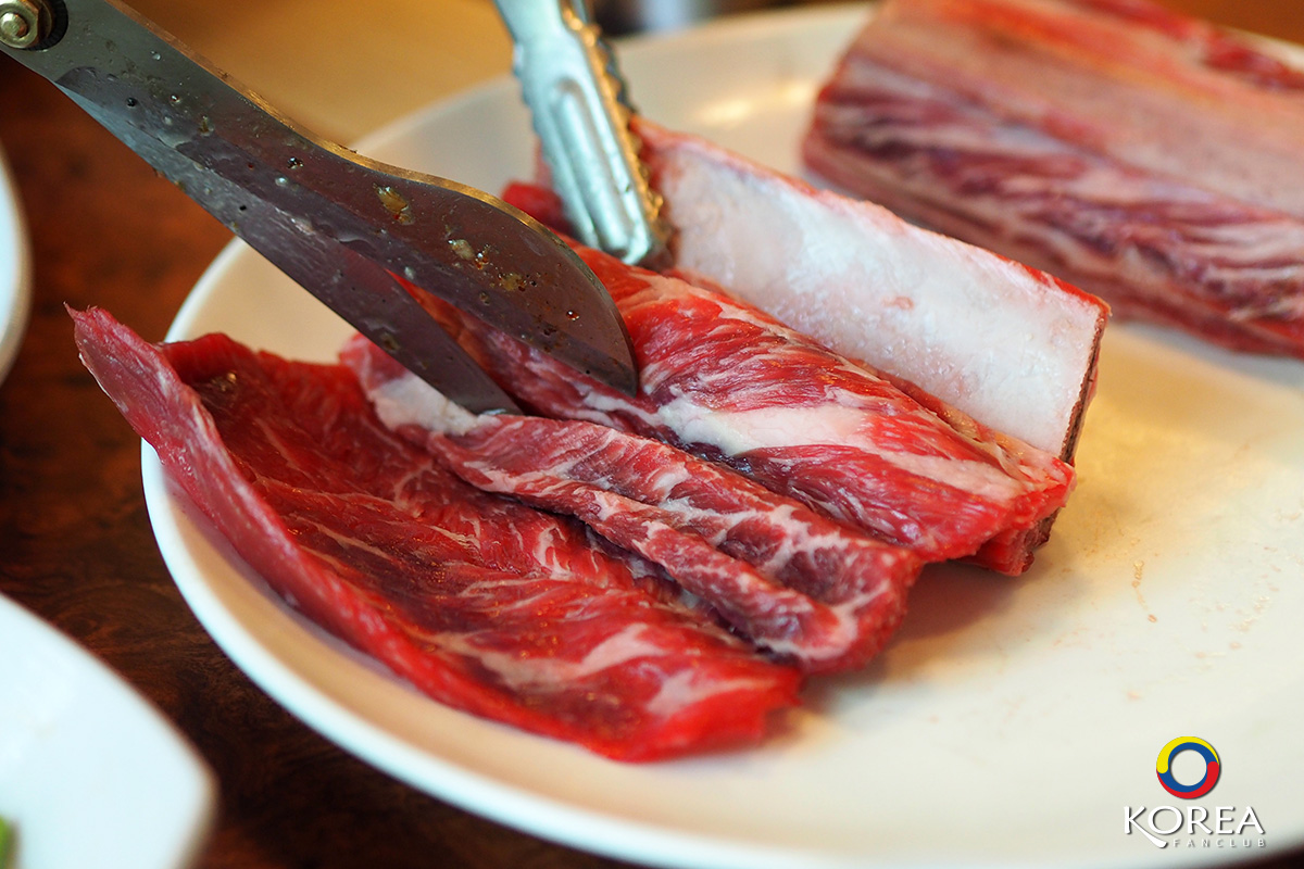 Grilled Beef Ribs ราคา 40,000 วอน เป็นเนื้อส่วนซี่โครง แล่เป็นแผ่นใหญ่ๆ ยาวๆ เวลาย่าง ต้องคลี่ออกก่อนนำลงไปย่างในเตา